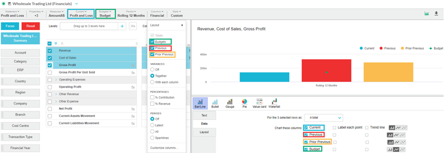 Change your view of the grid and watch the chart update accordingly. Your row selections are retained. For example, you might want to apply a different period or display all periods. See Change your view of a financial statement to learn about the different ways to change the layout and the contents of a statement.
