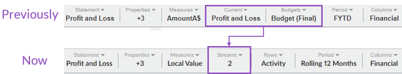 * The **Current** and **Budget** menus are combined into one **Streams** menu.<br>