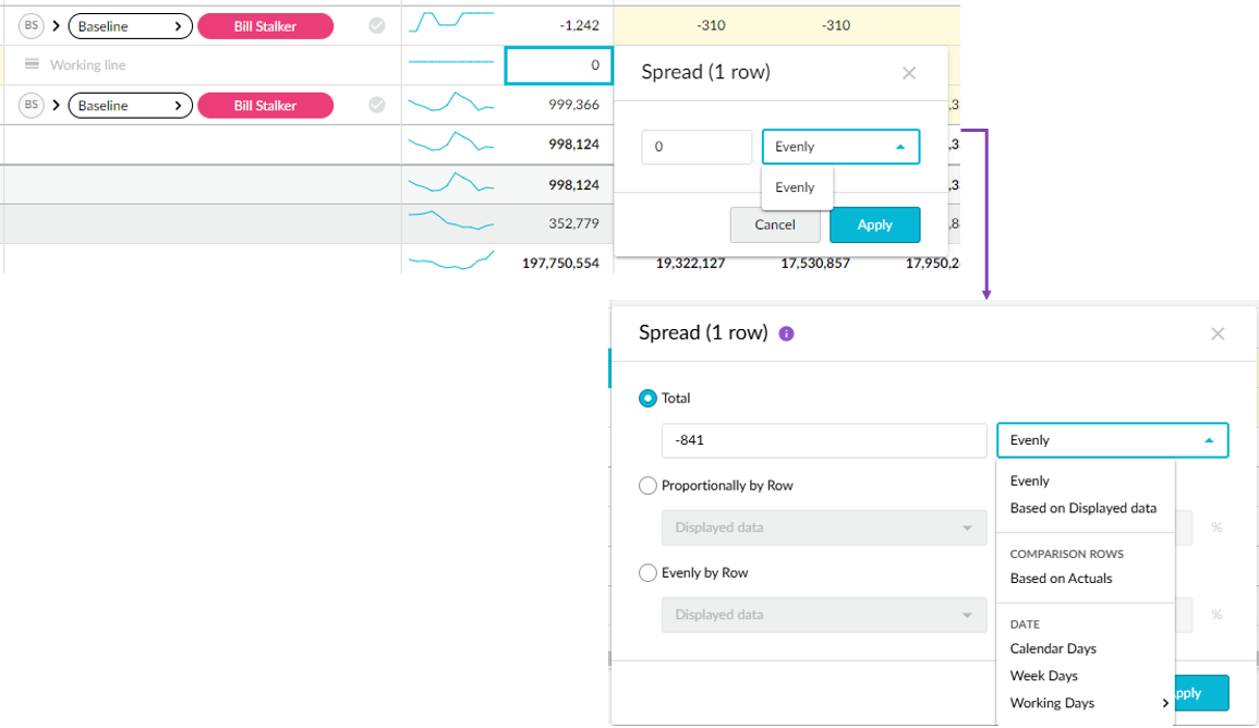 * **Working and sum line enhancement**: We added more spread options to working and sum lines. Previously, you could only spread *evenly* in these lines. The additional spread options will help you complete your data entry quicker in these lines.
