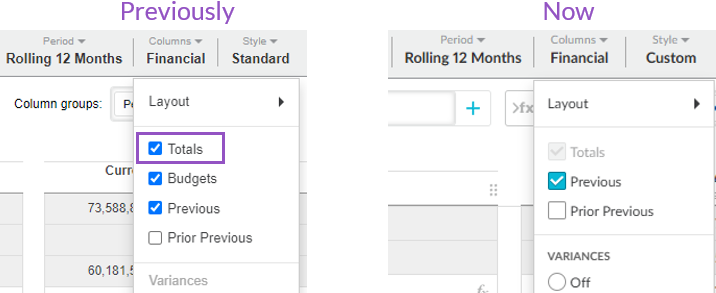 * The **Budgets** option is removed from the **Columns** menu. You now add budget columns via the new **Streams** menu.