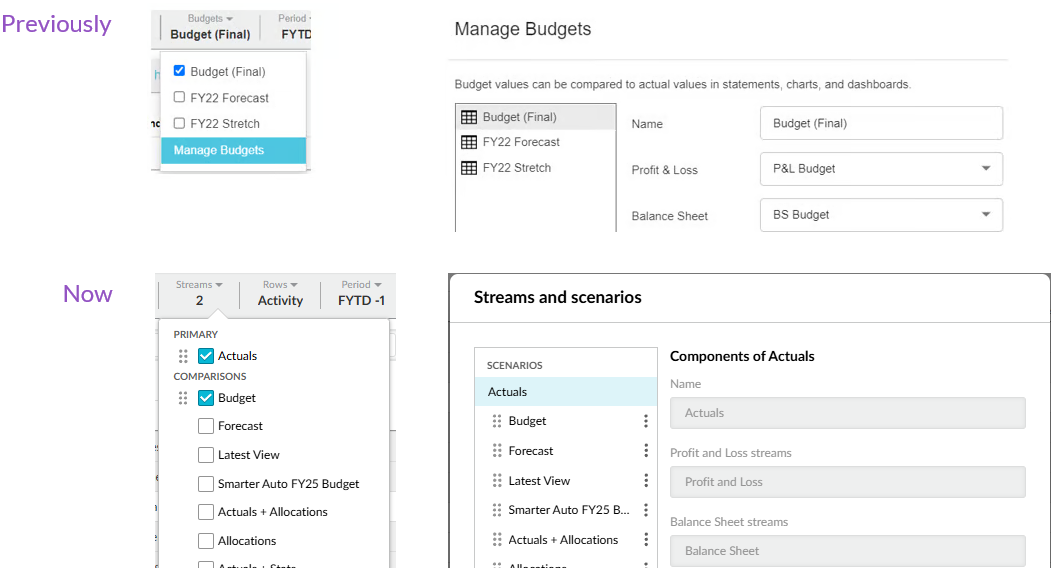 * The **Manage budgets** feature is replaced with the **Manage your streams and scenarios** feature, which you access this via the new **Streams** menu.