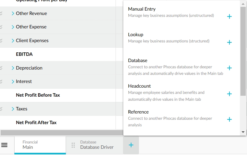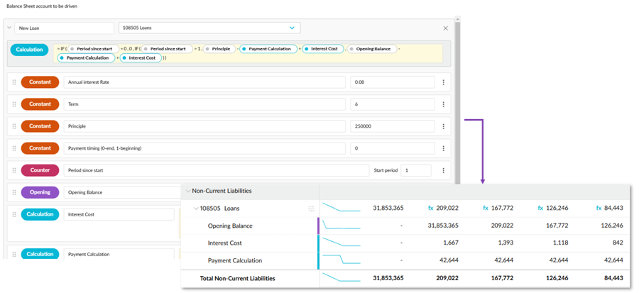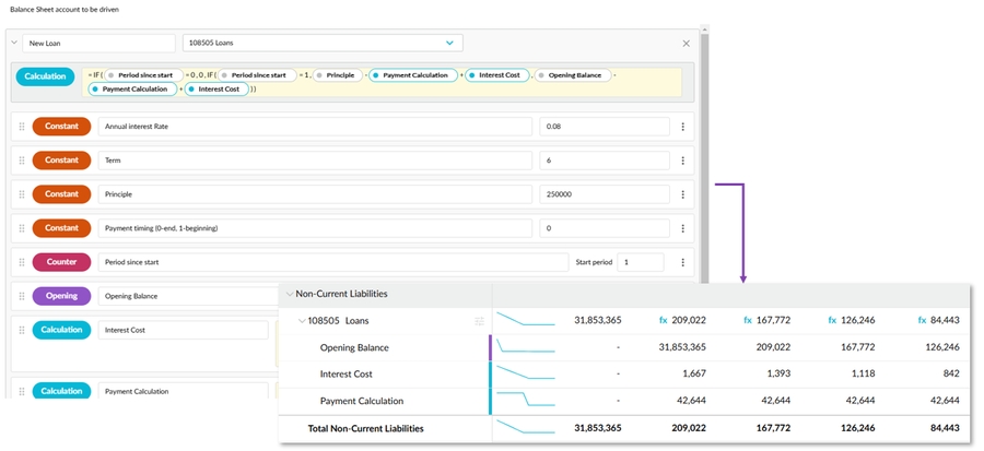 Loan mini drivers: We added two new types of mini driver templates for the Balance Sheet. The loan (amortization) mini drivers allow you to calculate interest payments and principal values for loans.