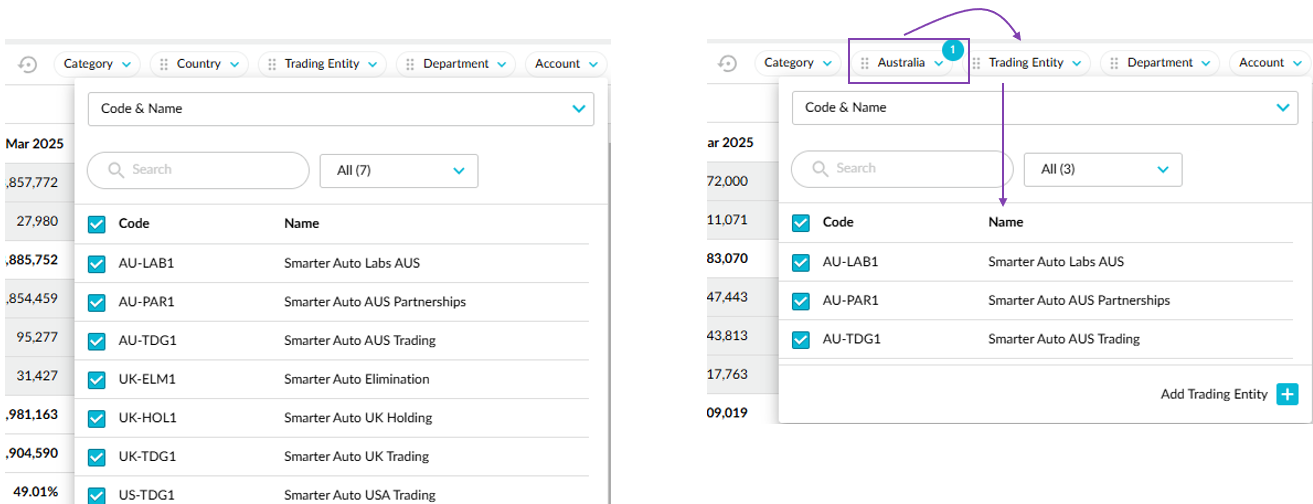 When a budget has multiple dimension levels, and you apply a filter to one of them, the other dimension levels now dynamically update according to that applied filter. For example, if you operate in three countries and have no filters applied, you'll see all the trading entities listed in the Trading Entity dimension, but if you filter the Country dimension to see the budget for Australia only, then go to filter the Trading Entity dimension, you'll only see the Australian trading entities in the list.