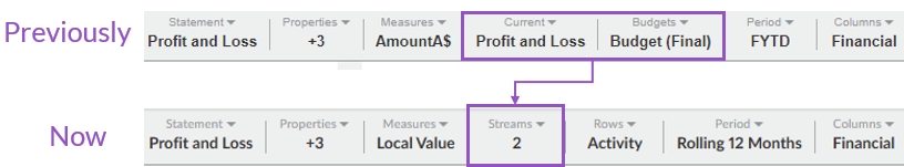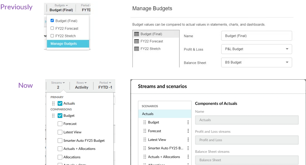 With these changes, it’s now possible to create budgets with multiple baseline value streams. This lets you build hybrid baselines, for example, using the current year's Actuals stream for completed months and a forecast or prior year stream for the remaining periods. Previously, achieving this required complex comparison rows and formula references.