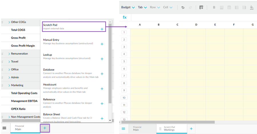 Scratch Pad tab: We added a new type of worksheet tab that supplements the Manual Entry and Lookup tabs. The Scratch Pad tab offers more flexibility, as it's totally unstructured and allows you to import data from Microsoft Excel to drive values in the other tabs.