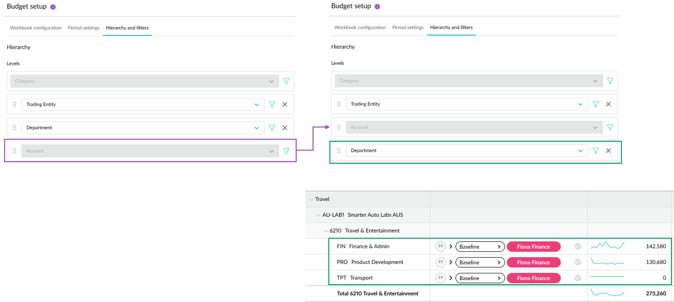 Budget hierarchy enhancement: Last November, we released a budget hierarchy enhancement that included the ability to reorder levels and determine the workflow level in operational budgets. This enhancement is now available for financial budgets, which means you can have dimensions below the Account dimension. For financial budgets, the workflow continues to sit at the lowest level as changing this would cause problems with driven rows. This improvement gives you more flexibility when it comes to setting up your budget.