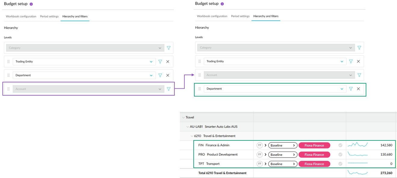 In financial budgets, you can only reorder the middle levels because Category remains at the highest level and Account remains at the lowest level. The workflow continues to sit at the Account level because of the various drivers that might drive those values.
