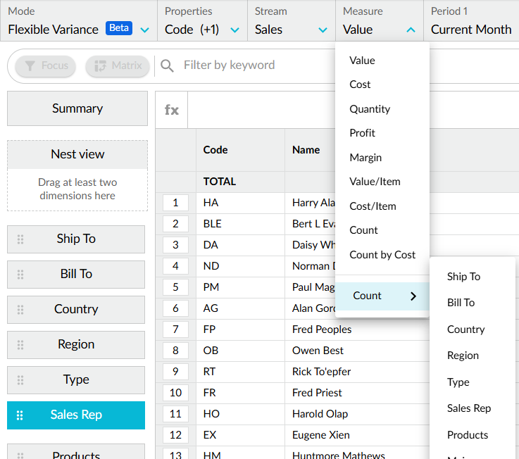 We added the Count option in the Measures menu that corresponds to the dimensions in the database. This is also available in measure columns, providing greater flexibility when it comes to determining the data that is displayed in the grid.