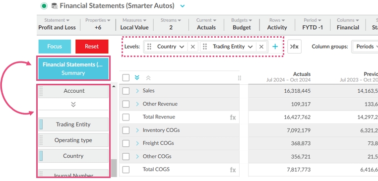 Now when you add a dimension as a level in a statement, then move into Analytics (by either clicking on a dimension or selecting and focusing on items), when you return to Financial Statements, the level persists in the statement. Previously, the level was forgotten, so you had to add it again.