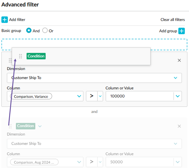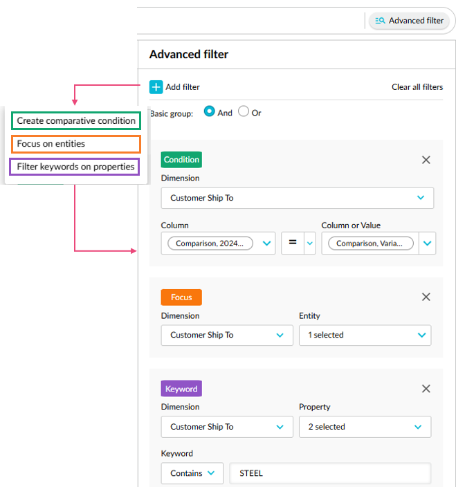 Advanced search: Previously, this panel only showed the filters you applied using the three other filtering methods. Now, you can initiate an advanced search from here. Click the Add filter button at the top, then select one of the filtering methods, and proceed to set the conditions.