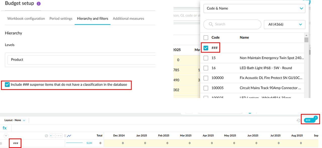 When the Include ### suspense items... setting is selected in the workbook setup, ### is now available as a dimension-level filter, so you can quickly include or exclude those items in the budget or forecast grid.