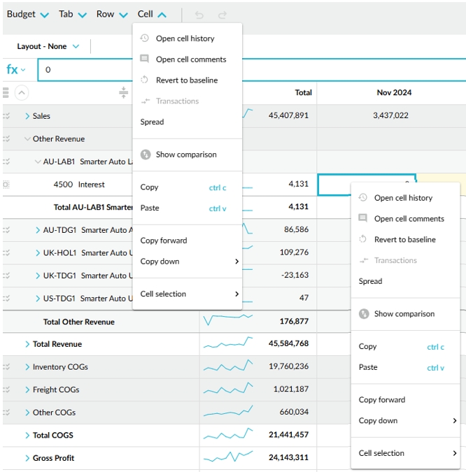 We consolidated the right-click context menus with the corresponding Budget, Tab, Row, and Cell menus that we recently introduced on the top-left of the grid. The respective menus are now consistent with each other, so you have two ways to access the same options. For example, whether you right-click a cell or click the Cell menu, you get the same menu.