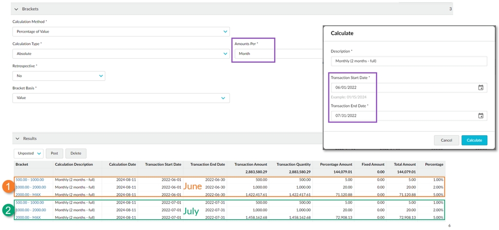 If the calculation period is from June 1 to July 31 (two full months), the results are split into two month periods. As the calculation started at the start of the calendar month, there's no cumulative total to factor in, so the rebate for each month is calculated as usual, based on the brackets that are hit in that period.