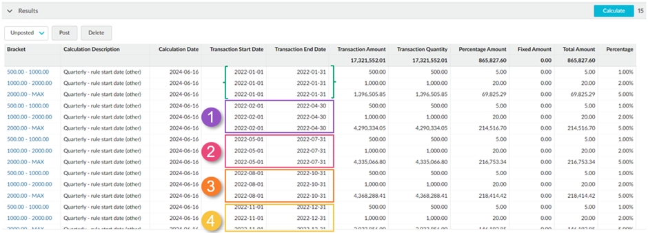 Suppose you start the calculation on the same date as the rule and run for the whole calendar year (12 months), however, the quarters start on a different date (February 1). In this case, some of the transactions (January 1 to 31) will fall outside the range of the quarterly year.