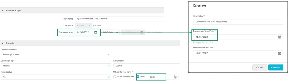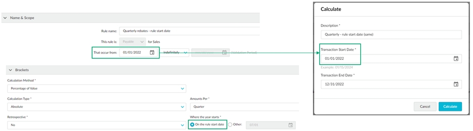 With the Amounts per > Quarter option, you can choose when your year starts, in other words, when you want the quarterly periods to begin. This can be the same as the rule validation date or a different specified date.
