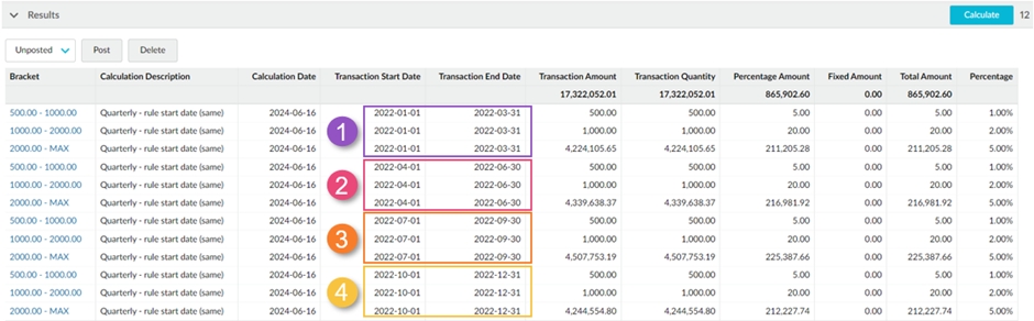 In this basic example, two calculations are run for the same rule, yielding different results. The same calculation date range (Jan 1, 2022 to Dec 32, 2022) is applied to each calculation. The calculation start date is the same as the rule start date (Jan 1, 2022). The only difference is the date on which the quarters start.