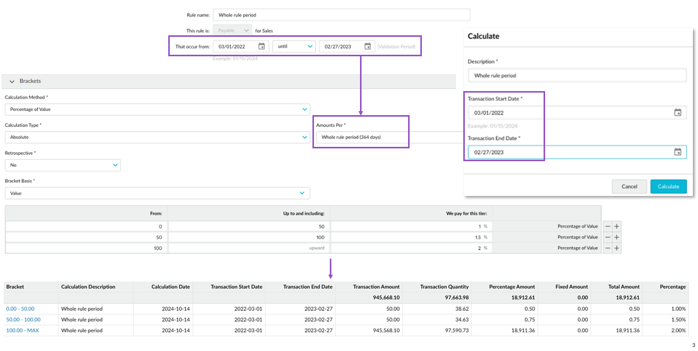 The **Amounts per** > **Whole rule period** option is only available when the calculation type is **Absolute,** and the rule validation period (from start to end date) is less than one year (364 days or less).