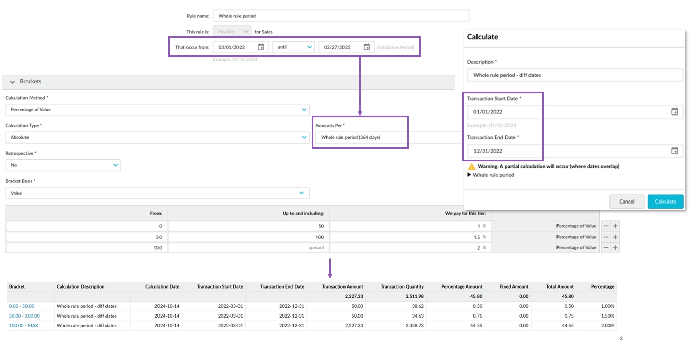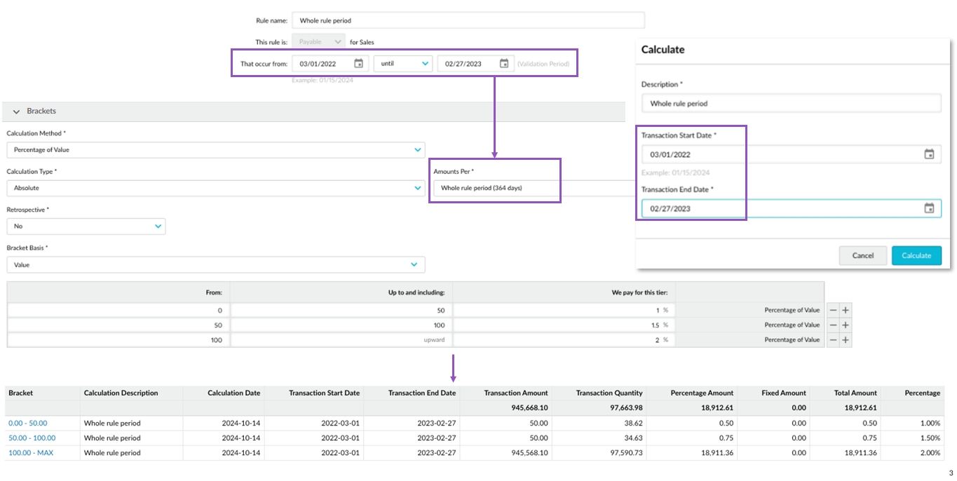 In this example, two calculations are run for the same rule, yielding different results. The rule validation period is March 1, 2022 to February 27, 2023. The calculation periods are different.