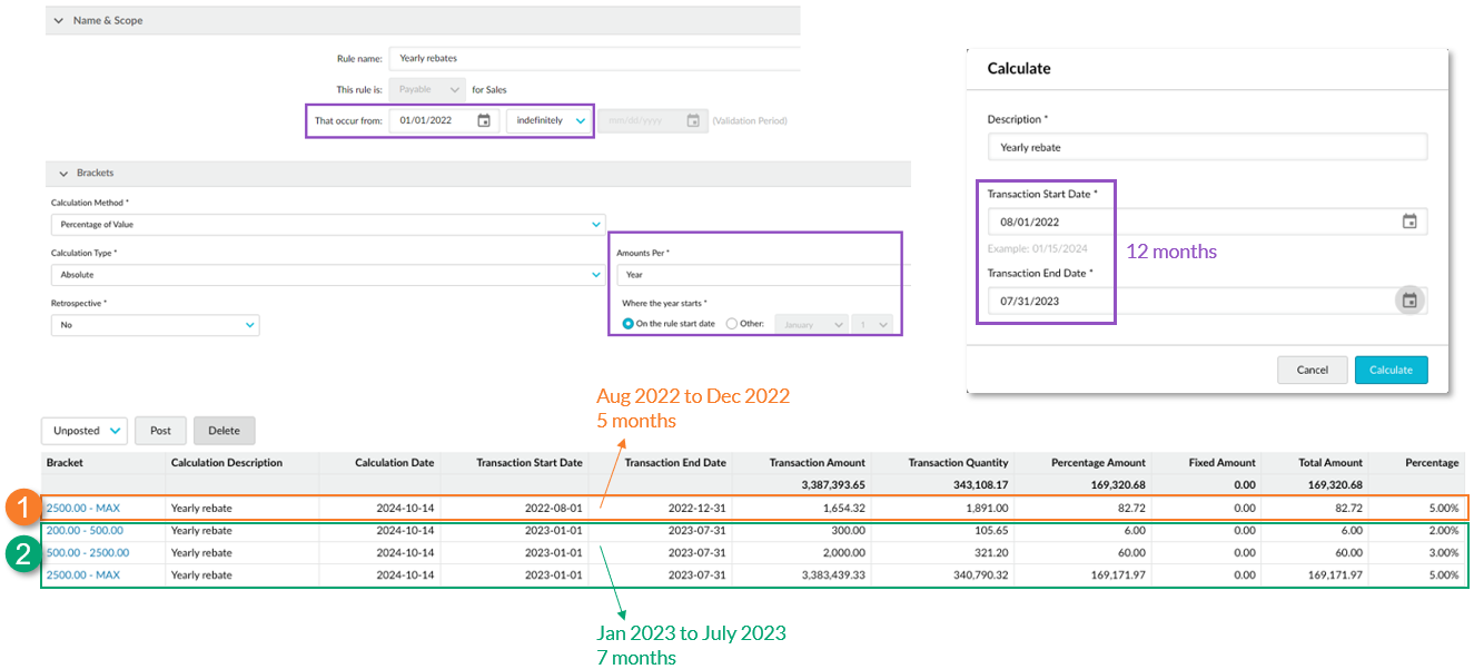 Suppose the rule starts on January 1 and it uses the Percentage of Value calculation method, the Value bracket basis, and has three brackets. You select Amounts per > Year > On the rule start date. The rule year runs from January to December. You start the calculation year in August 2022 and end it in July 2023. In this case, the calculation is for 12 months that span across two calendar years.